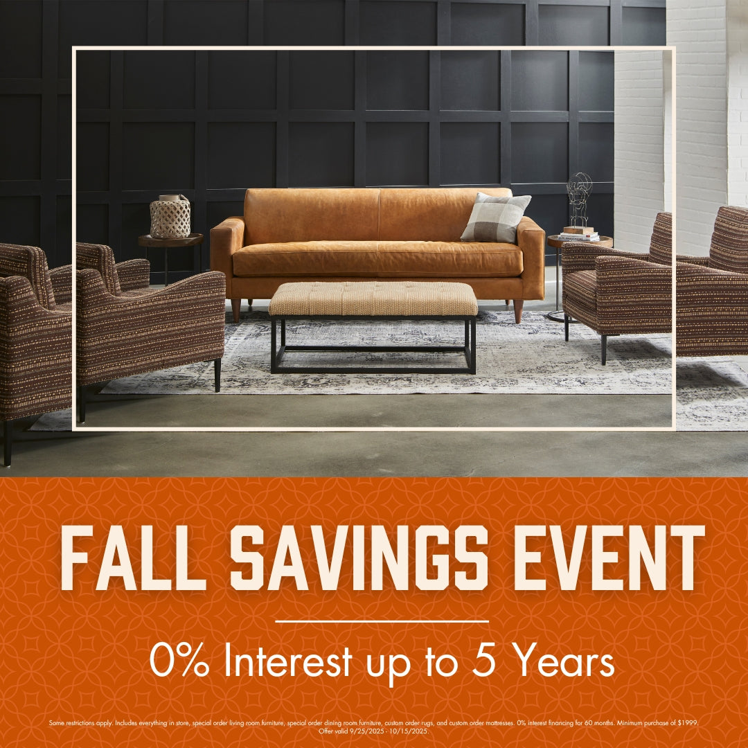 0% Interest up to 5 Years. Some restrictions apply. Includes everything in store, special order living rcom furniture, special order dining room furniture, custom order rugs, and custom order mattresses. 0% interest financing for 60 months. Minimum purchase of $1999.
