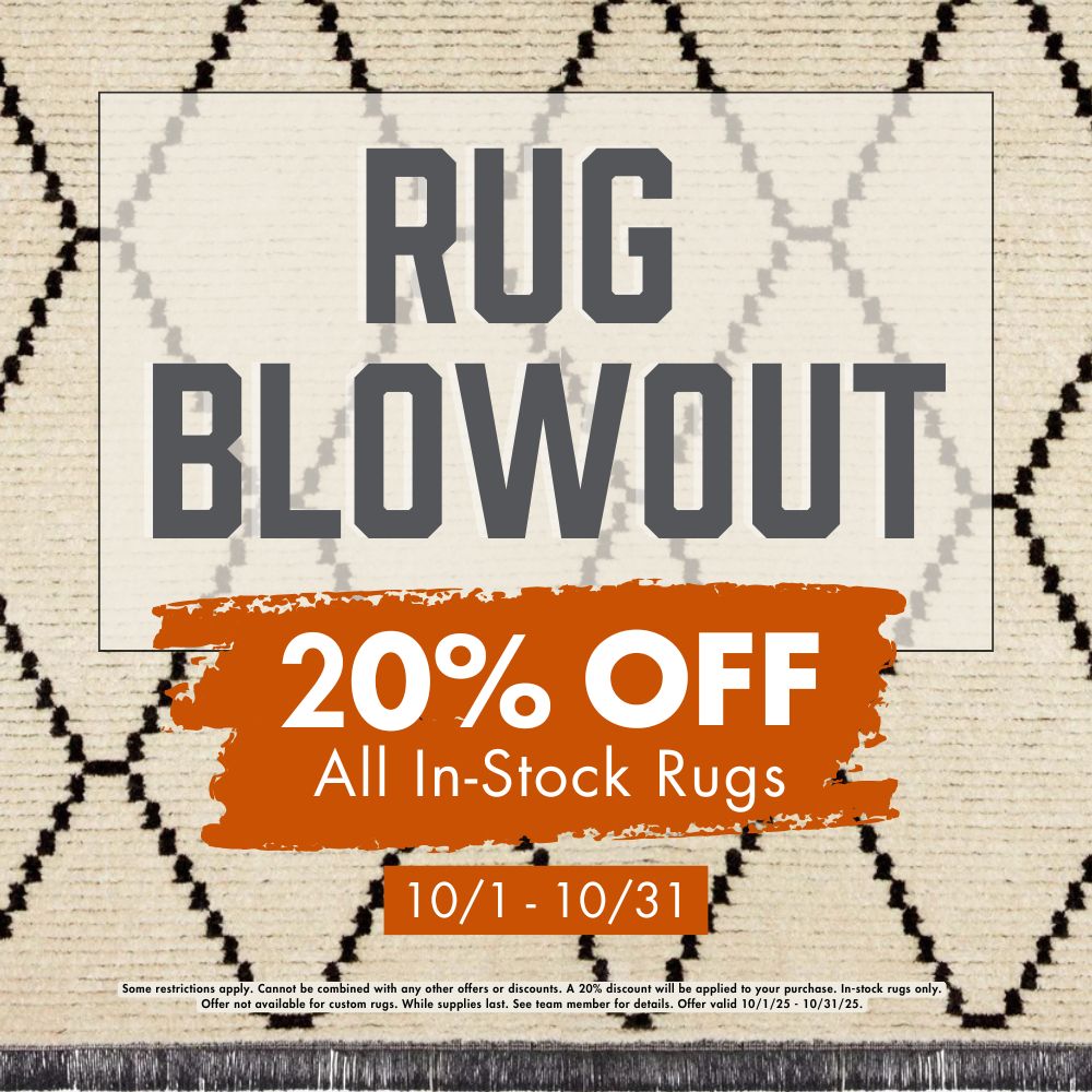 Some restrictions apply. Cannot be combined with any other offers or discounts. A 20% discount will be applied to your purchase. In-stock rugs only. Offer not available for custom rugs. While supplies last. See team member for details. Offer valid 10/1/25 - 10/31/25.