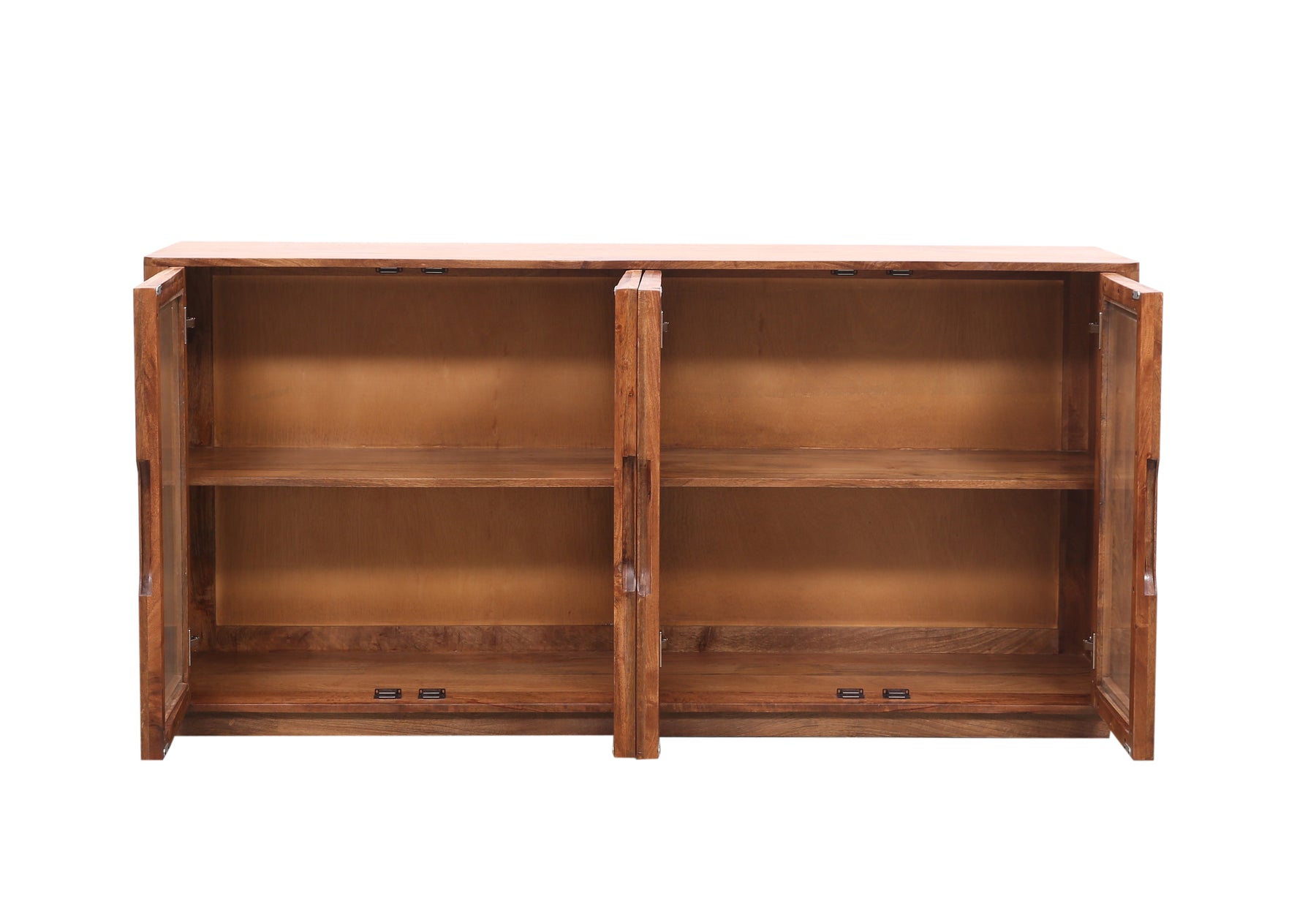 The Breton Glass 4-Door Sideboard brings timeless elegance to any space. Crafted from solid wood with a distressed walnut finish, this piece seamlessly blends modern sensibilities with traditional design. Four glass-fronted doors showcase your finest dishware and décor while keeping everything organized and dust-free. The sturdy construction and refined aesthetic make it a statement piece that elevates your home's sophistication for years to come.