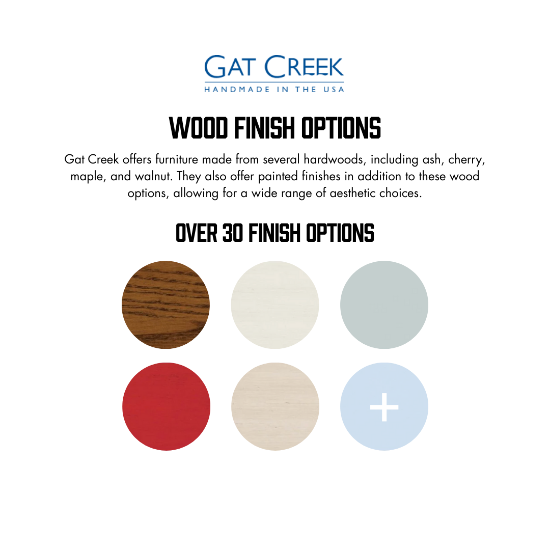 Gat Creek Furniture delivers finely crafted, solid wood pieces designed for modern living and built with pride in the heart of Appalachia. Every item is made to order by a single builder, signed and dated, reflecting a commitment to integrity and personalization. With a wide selection of finishes, sizes, and styles—from sleek contemporary to classic American—Gat Creek furniture honors the natural beauty of solid wood while offering timeless durability. FSC-certified and crafted with care, each piece supports sustainable forestry and American craftsmanship at its finest.