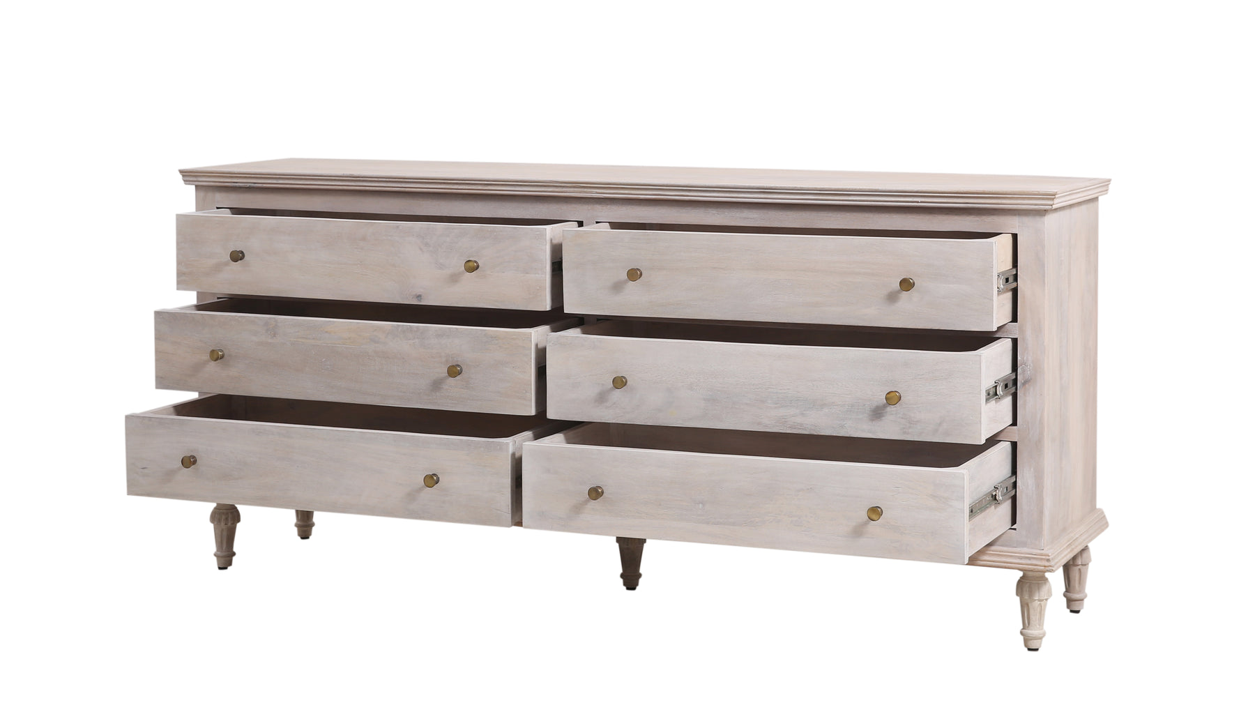 Elevate your bedroom with the Fox & Roe Maison 6 Drawer Dresser, a stunning piece inspired by timeless late 18th-century French design. Crafted from solid wood and available in three distinctive finishes, this dresser combines classic elegance with practical storage. Six spacious drawers provide ample room for clothing and accessories, while its refined silhouette adds sophisticated charm to any décor. Whether you're furnishing a master suite or guest room, the Maison dresser brings enduring style and quality craftsmanship to your space.