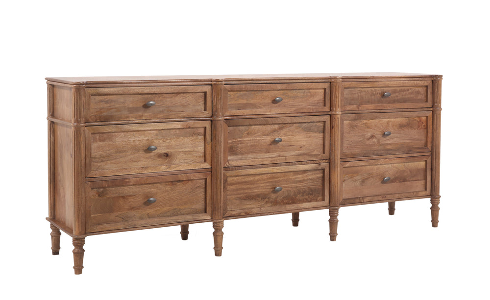 Upgrade your bedroom with the Fox & Roe Hugo Bedroom Collection Dresser. Made with mango wood and finished in washed walnut, it features 9 spacious drawers for all your storage needs. Add warmth to your space while staying organized with this stylish and functional piece.