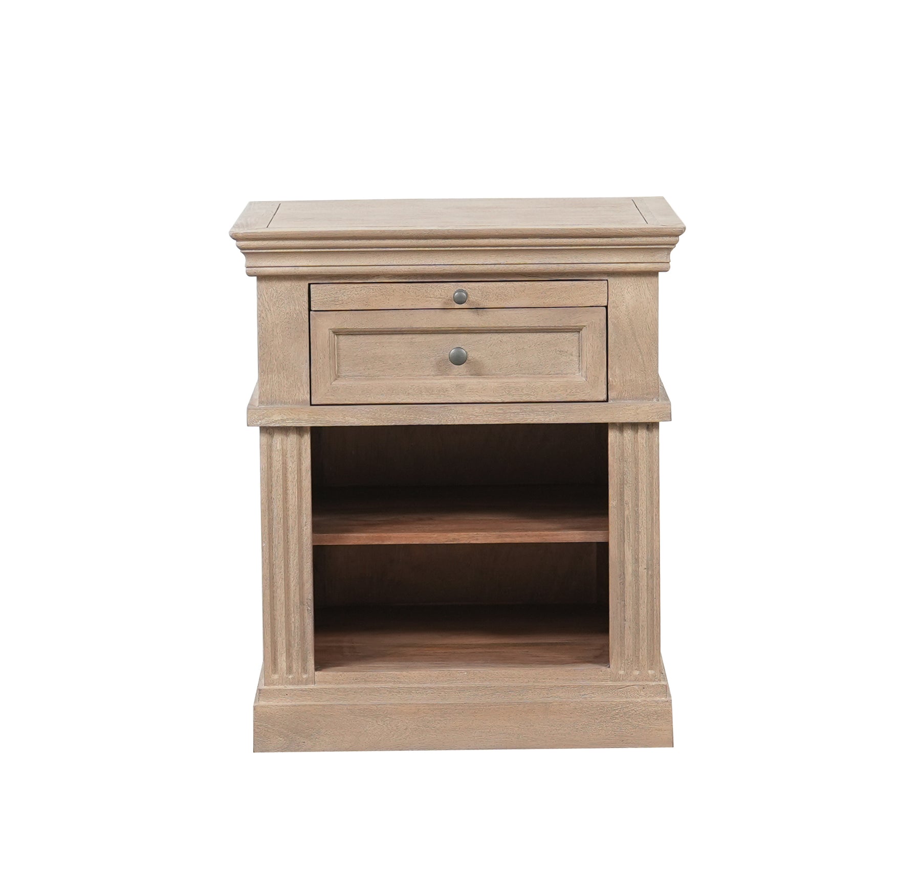 The Livingston Nightstand brings timeless elegance to your bedroom with its solid wood construction and traditional design. Featuring two open drawers, one closed drawer, and a convenient pull-out tray, this sturdy piece offers versatile storage for everything from bedside essentials to your favorite books and beverages. Hand-carved details add warmth and character, creating a focal point that complements any décor. Built to last, the Livingston combines functionality with classic craftsmanship that transforms your nighttime routine into a moment of refined comfort.