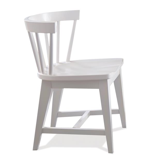 The Cora Windsor Side Chair by Riverside Furniture combines classic design with modern craftsmanship. Constructed from select hardwoods, it features a modernized Windsor shape with round spindles and an arched top rail. The saddle-shaped wood seat ensures comfort, while side stretchers provide added strength. Finished in a soft "Cloud" hue, this chair is ideal for casual dining spaces, offering both style and durability.