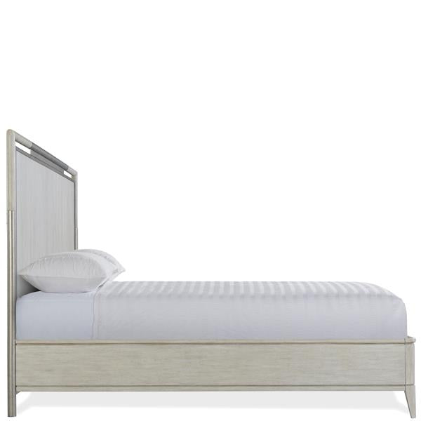 The Maisie Panel Bed by Riverside Furniture exudes refined glamour with its clean lines and soft, rounded corners. Crafted from hardwood solids and cherry veneer, it features a champagne finish and metal framework, offering a light, airy feel with metallic accents.
