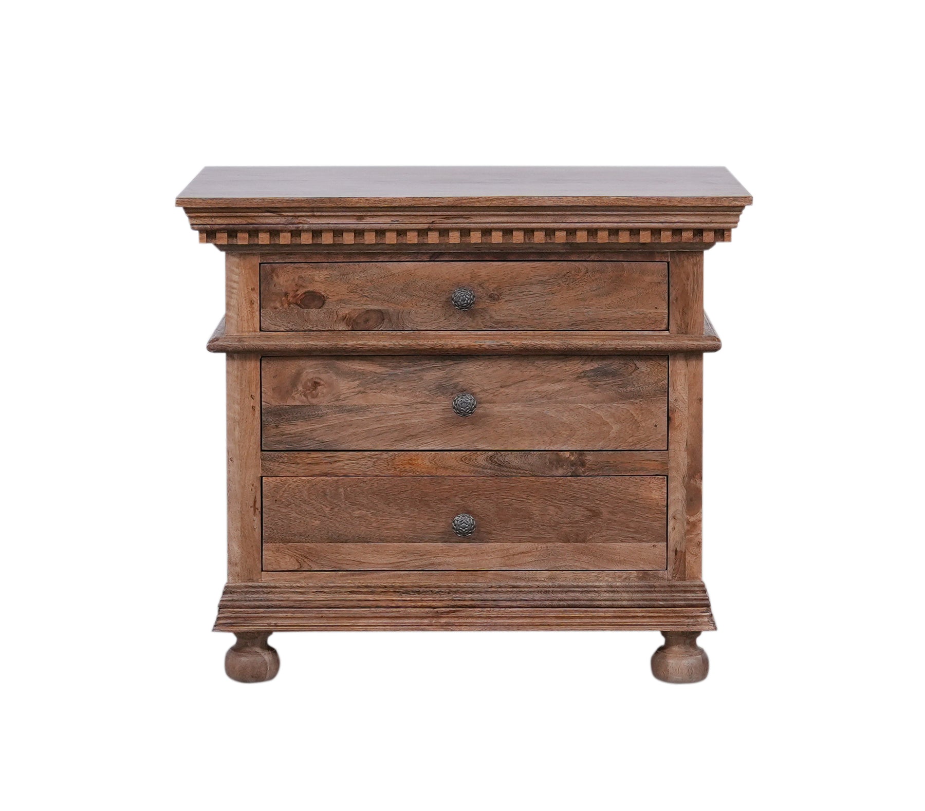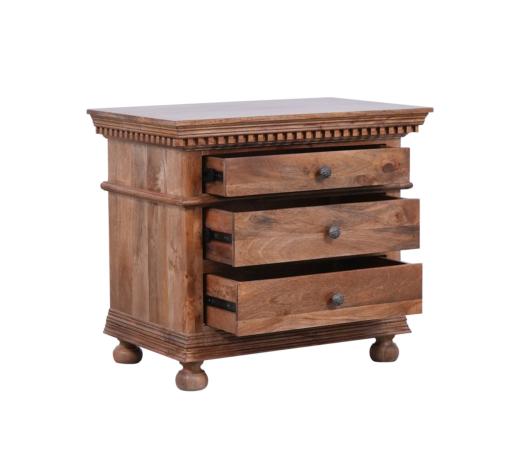 The St. James Nightstand brings timeless elegance to your bedroom with its solid wood construction and intricate carved details. This closed design features sophisticated trim work and traditional craftsmanship that elevates any décor style. Perfect for keeping nighttime essentials organized and out of sight, its sturdy build ensures lasting beauty and functionality for years to come.