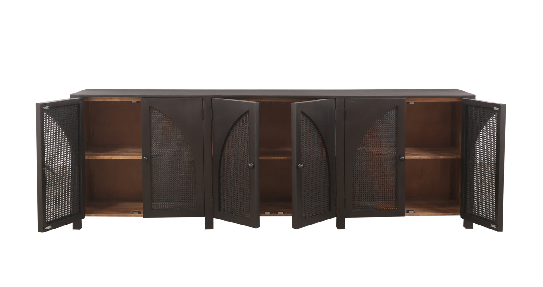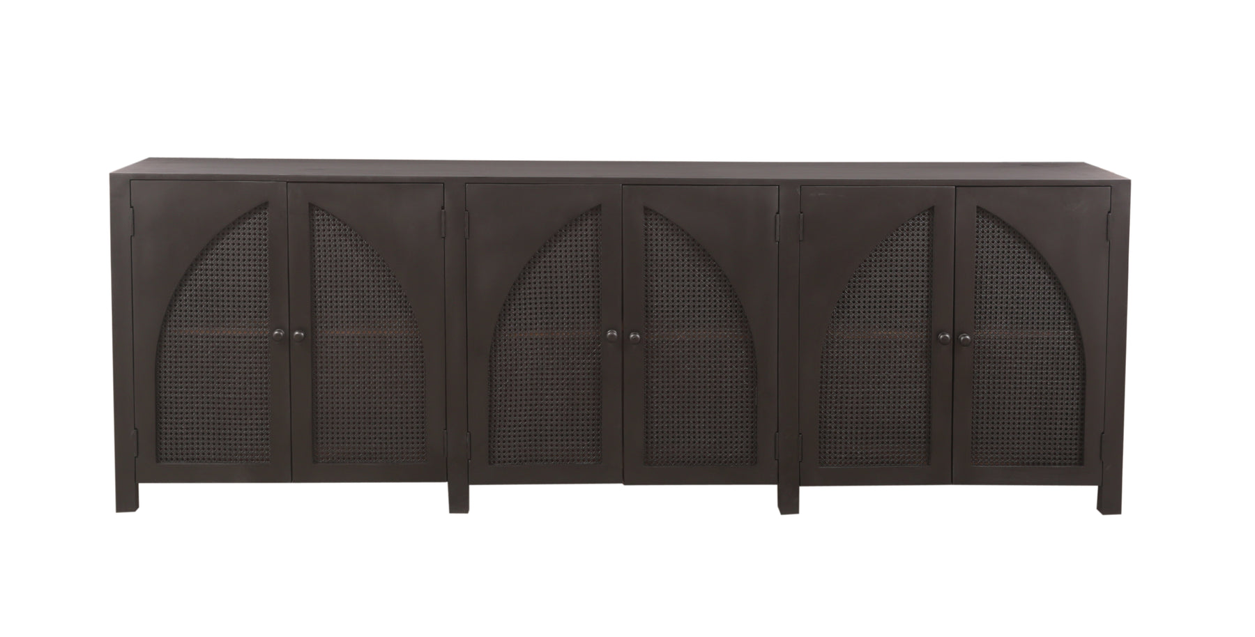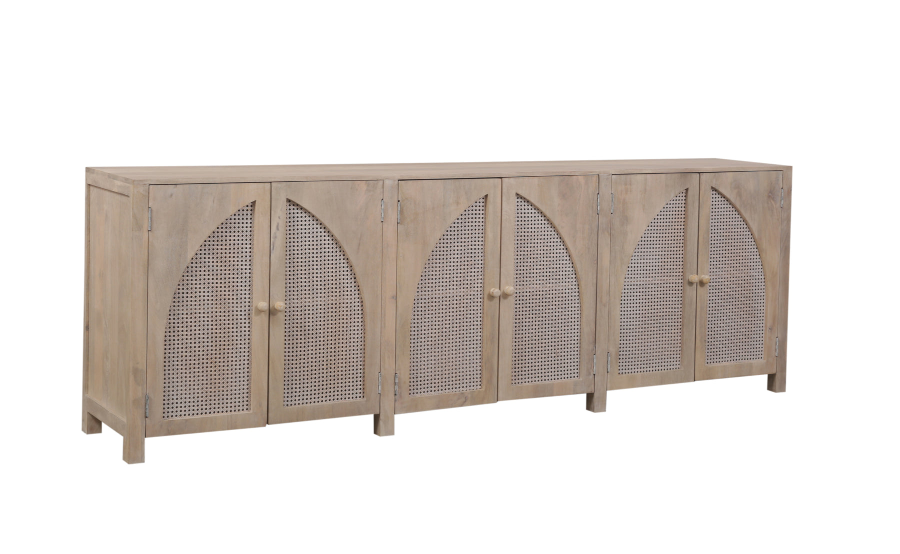 The Tilda 6 Door Sideboard brings contemporary elegance to any space with its striking arched cane panel design. Crafted from solid wood, this modern statement piece features six doors and two internal shelves, offering generous storage for dining essentials, décor, or everyday items. The sophisticated cane detailing adds visual interest while maintaining a clean, minimalist aesthetic that complements both traditional and contemporary interiors. Versatile enough for the dining room, living room, or entryway, the Tilda combines style with practical functionality for the discerning homeowner.